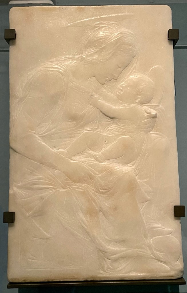 What a high we begin with, an exquisite marble relief, up there with the Pazzi Madonna from yesterday, another ‘Virgin and Child’ (1425-30). Smaller than yesterday’s work but infinitely subtle and infused with delicate details and ephemeral presences.