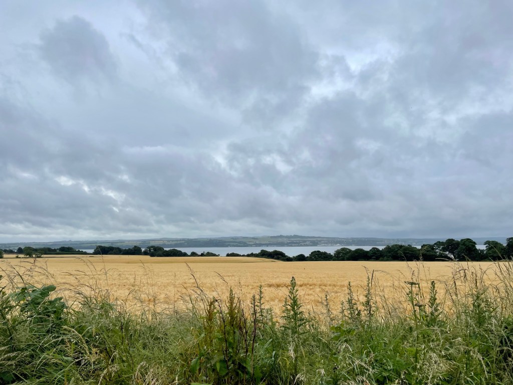 The path runs along the coast until reaching Culross, a historic village which we have visited before so did not divert to on this walk. Part of the reason for this was that the promised rain had arrived (as soon as we sat down and opened the thermos). After another woodland section came a rather dreary section pounding that pavements through Newmills into Torryburn. It was a relief to eventually escape and climb to a pleasant farmland scene, although the rain was a persistent niggle.