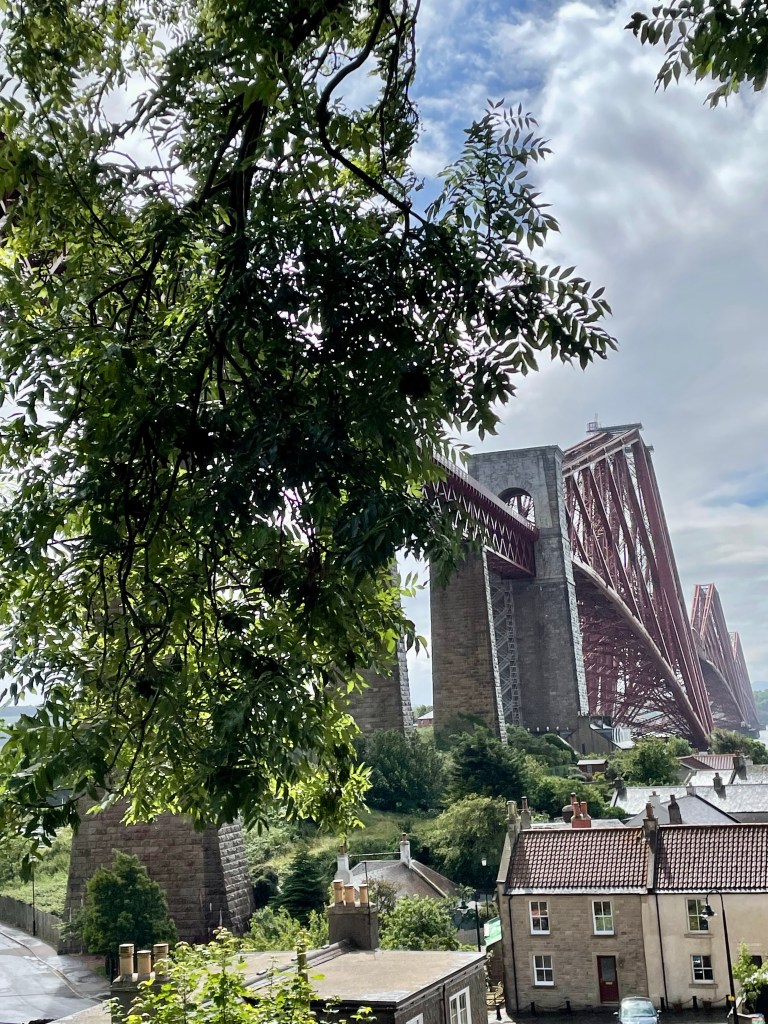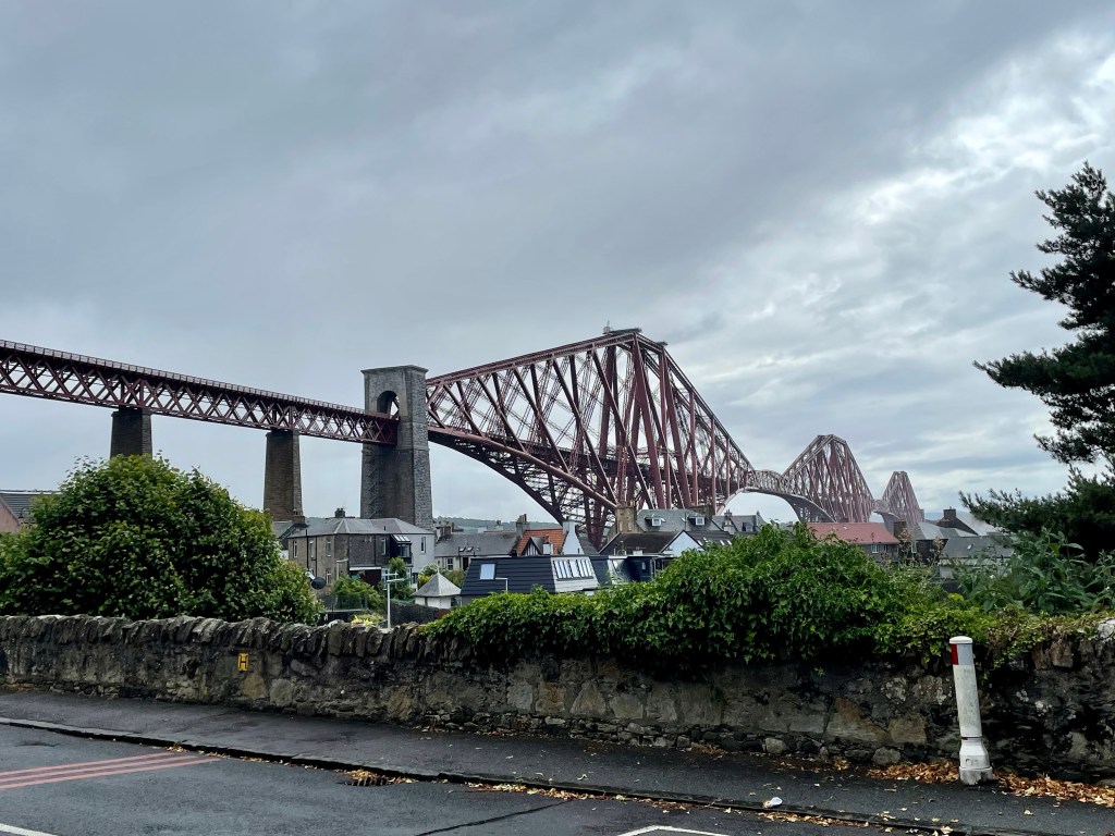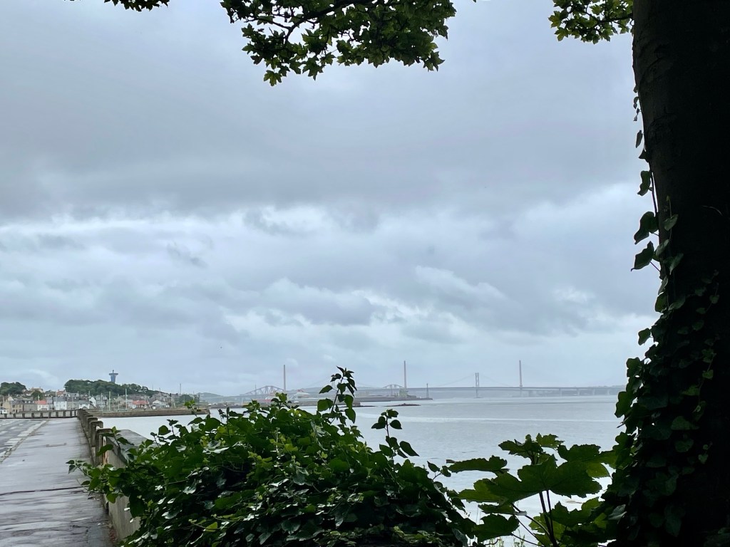 However, it was a long slog to North Queensferry yet and the gathering clouds finally released their rain just as we finally reached the town and dared to consider stopping and reaching for the coffee. It was a relatively short shower but sharp enough to metaphorically and literally put a damper on proceedings, but we still managed to appreciate the fine views of the three crossings. The rail bridge remains one of my favourite Scottish landmarks, an iconic structure which does our heritage proud.