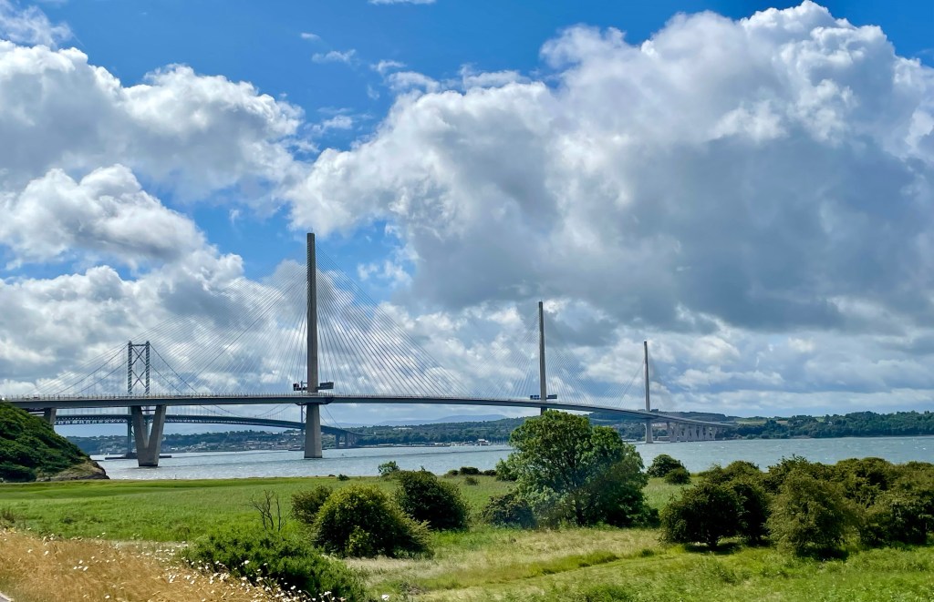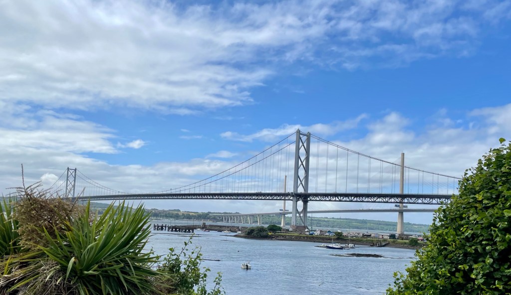 The thrum of traffic announced we had arrived at a busy road and for the next mile we were buffeted by the noise and wind of vehicles passing at speed. It was a relief to turn off into the streets of Rosyth but the townscape proved rather dreary (sorry to any local readers!) as we descended gradually towards the port area and a long stretch beside an almost disused road. The sight of the Queensferry Crossing gave hope that more interesting areas lay ahead, much needed as we were 6 miles into the walk.